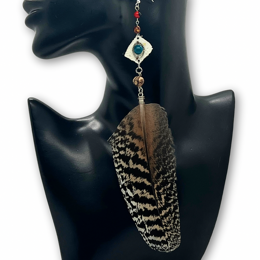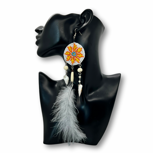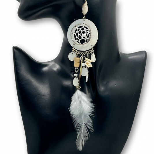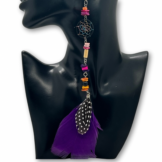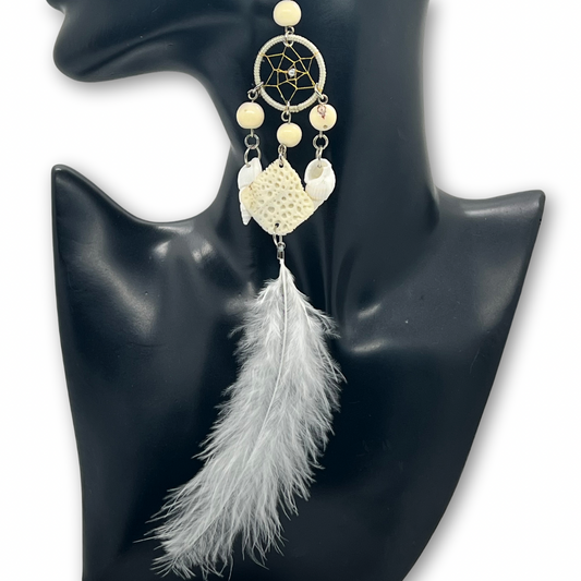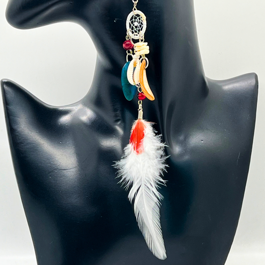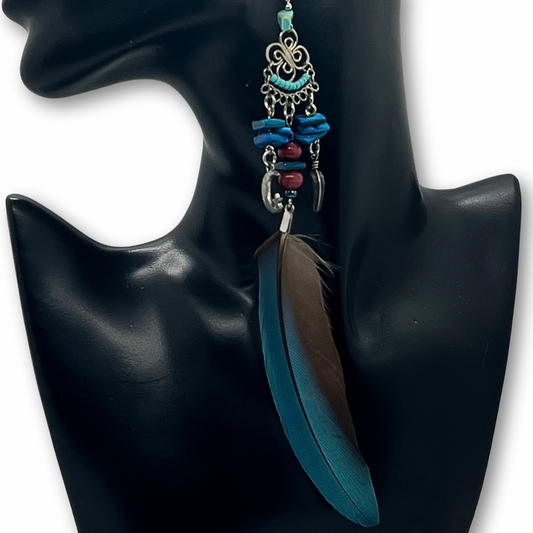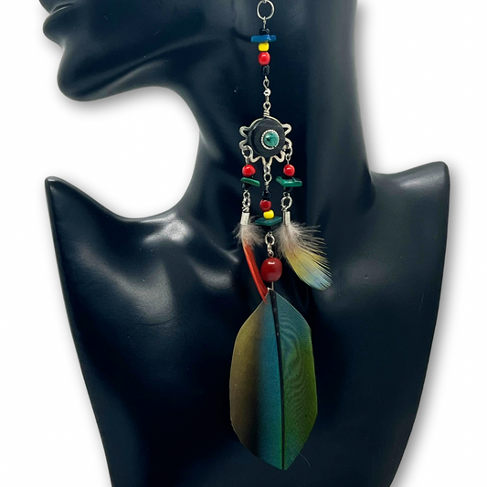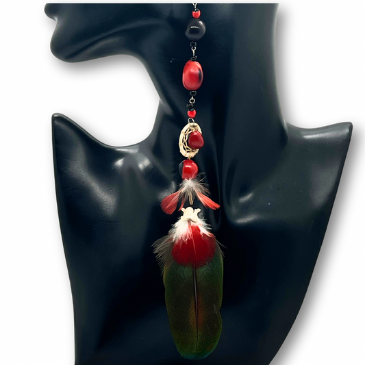 Solitarios earrings are a captivating collection of handcrafted jewelry that embodies the essence of the Amazon. Each piece is a unique blend of natural elements like Guacamayo feathers, huayruro seeds, and porcupine spikes, combined with symbols of nature and spirituality such as stones, dream catchers, and celestial motifs. Designed to make a statement, these earrings vary in size, typically around 9 inches in length and 1.5 inches wide, offering a bold, yet elegant accessory option. Fitted with hypoallergenic hooks, Solitarios earrings are comfortable for anyone to wear, bringing a piece of the Amazon's vibrant spirit and deep cultural heritage to your everyday style.