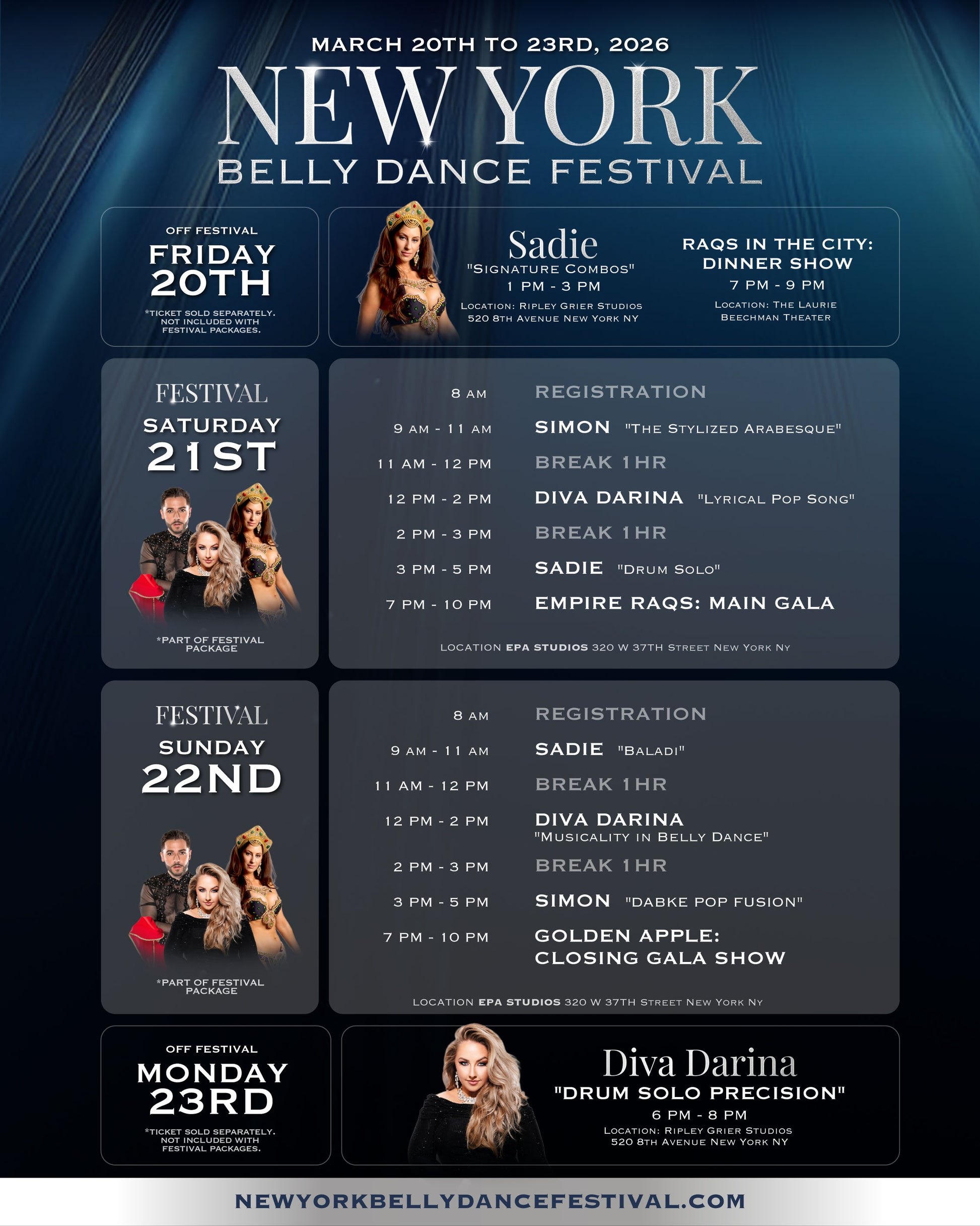 Join individual classes with our Master instructors and special guest artists during the New York Belly Dance Festival 2026, happening March 20–23 in New York City.